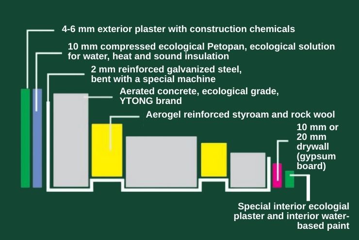 4–6 mm plaster, 10–20 mm aerated concrete or PETO panels. Ecological materials with aerogel/composite insulation. Roof: lightweight steel + sandwich panels, waterproof membrane.